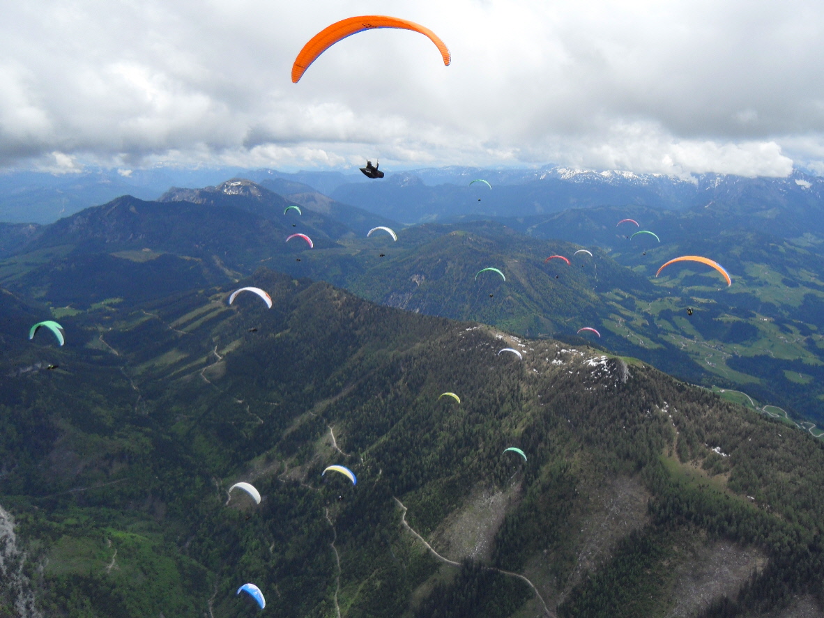 La manga la ponen rápido: 54 kms, ida y casi vuelta a un pico al este a 25 kms, baliza previa y gol en Abtenau. Todos pensamos que va a estar muy flojo, han entrado nubes altas y no se ve casi sol. Pero no, se forman cúmulos bastante gruesos, con techos a diferentes alturas muy bonito para las fotos, con buenas ascendencias y un camino claro.