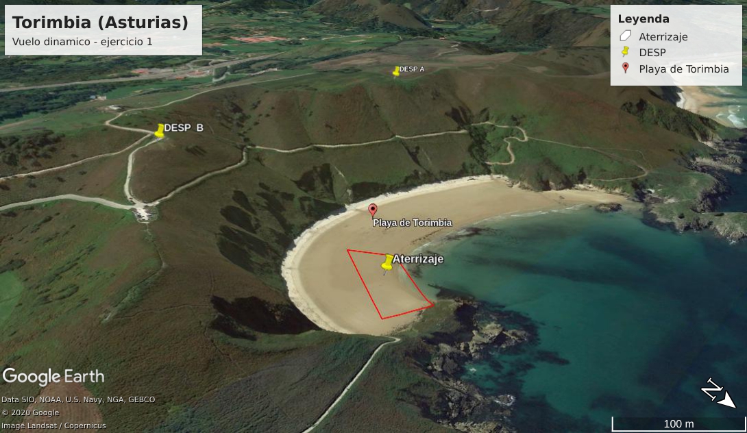 Si el viento viene del NO deberías de hacer los ochos un poco más atrás de la zona de aterrizaje y lo ideal sería aterrizar de frente al mar ya que deberías de enfrentarte al viento NO. Pero otra posibilidad para estar más seguros de tener distancia suficiente al aterrizar sería hacer los ochos en la parte baja del rectángulo y aterrizar en dirección Oeste a lo largo de la costa de la playa desde abajo del rectángulo rojo hacia arriba.